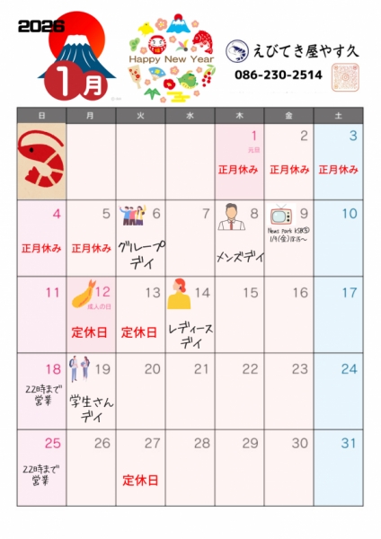 2026年1月カレンダー&ハッピーデイです🦐