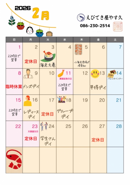 2026年2月カレンダー&ハッピーデイです🦐