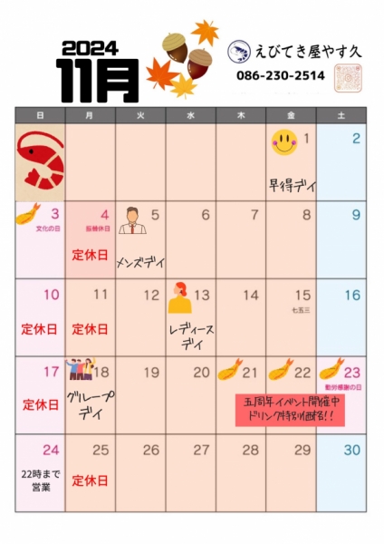 2025年4月カレンダー&ハッピーデイです🦐「JR岡山駅」よりほど近く。岡山市、柳川電停近くに店...